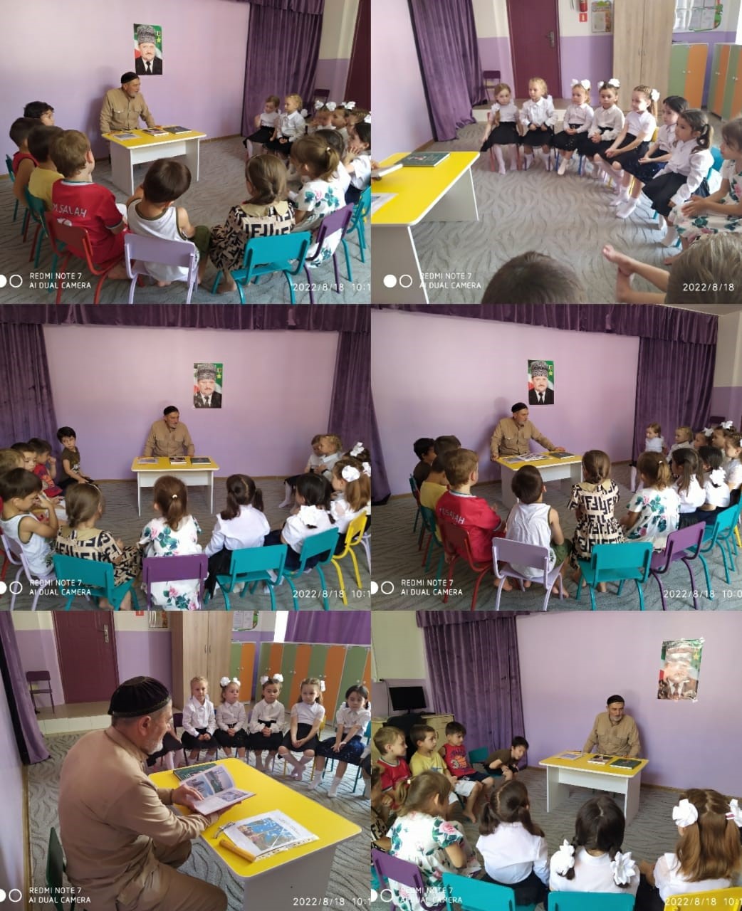 - 19.08.2022 воспитанники старшей группы «Ромашка» (присутствовало 7 детей и 1 воспитатель) читали стихи, посвященные Первому Президенту ЧР, Героя России А-Х.А. Кадырова.