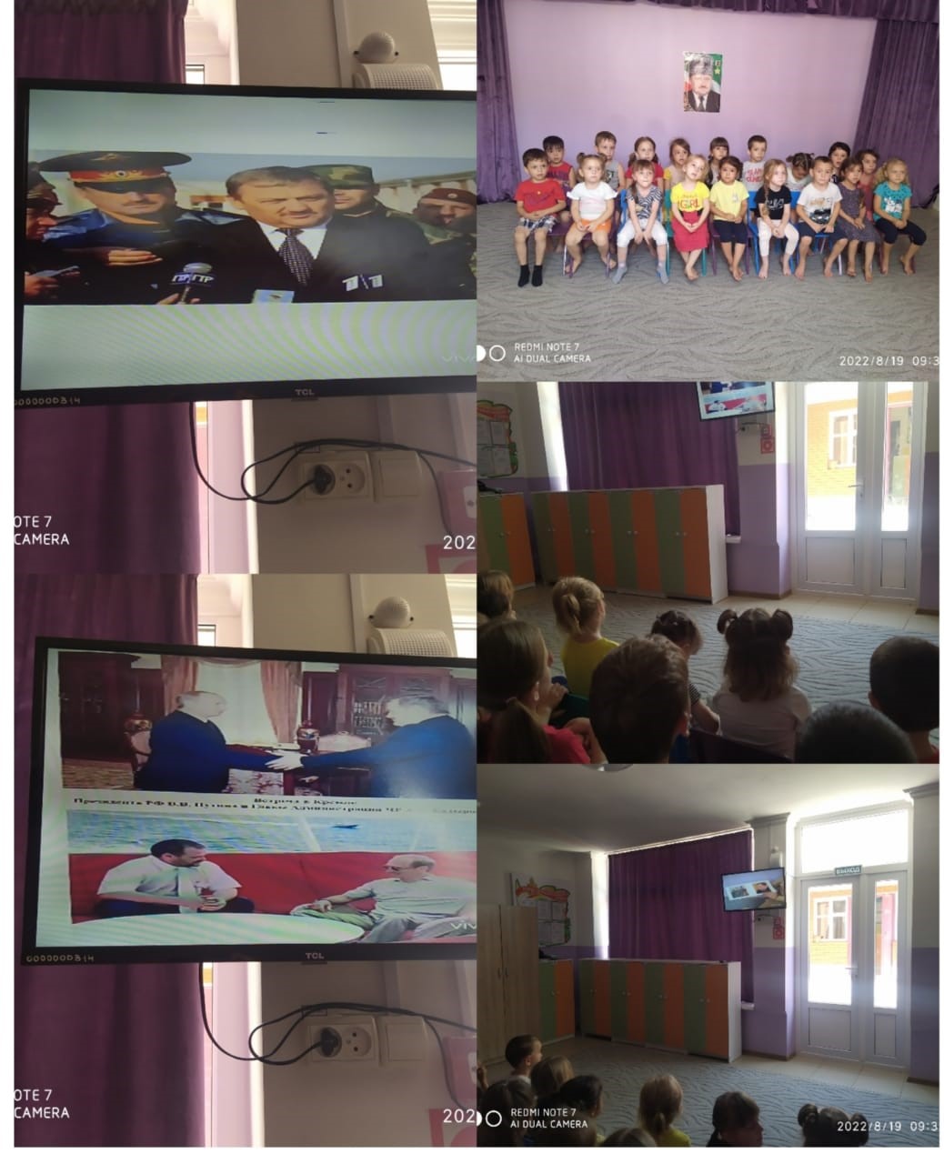 - 19.08.2022 в старшей группе «Ромашка» (присутствовало 7 детей и 1 воспитатель) прошла презентация фотографий Первого Президента ЧР, Героя России А-Х.А. Кадырова.